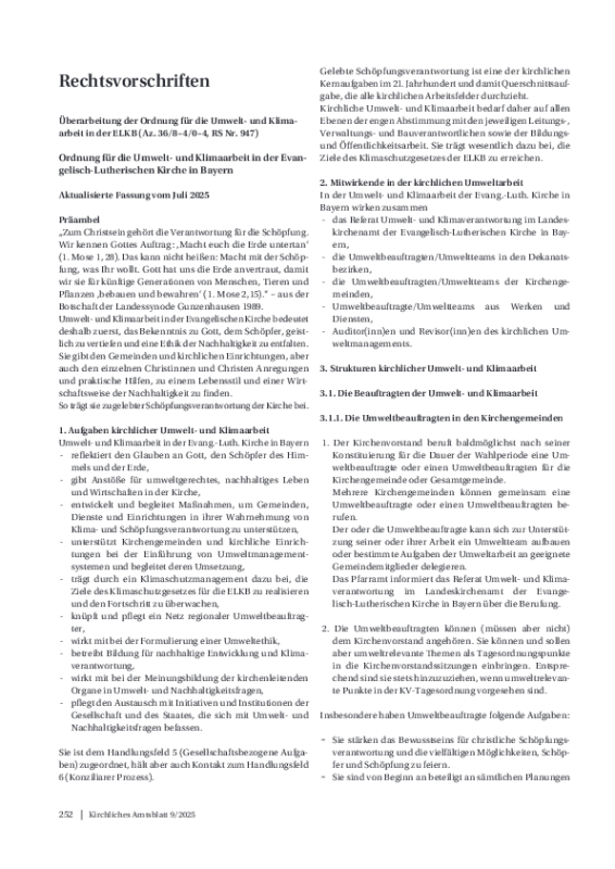 Die Ordnung der Umwelt- und Klimaarbeit in der ELKB regelt Strukturen und Zuständigkeiten von Haupt- und Ehrenamtlichen in diesem Arbeitsbereich. Die vorliegende Fassung ist seit Juli 2025 in Kraft.